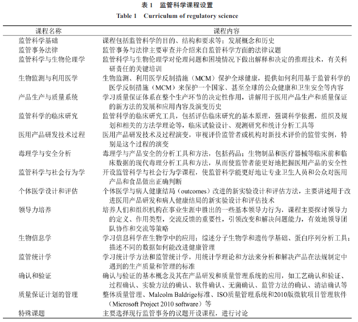 2019年11—12月,国家药品监督管理局批复山东大学、沈阳药科大学、华南理工大学和北京工商大学为化妆品监管科学研究基地等。这些依托国内知名高等院校、科研机构建设的国家药品监管科学研究基地对进一步提高药品监管效能和水平发挥大学优势,紧紧围绕我国药品创新发展和监管科学的战略需求,聚焦药品科技前沿、科技成果转移转化、高端人才培养、药品监管新方法、检验检测新技术、标准制修订、风险分析和预警、安全评价、应急处置等重点领域开展研究,有利于原创性研究和科技攻关,其产出成果有力服务了药品监管大局,达到科学监管。笔者认为应该发挥院校在培养高端监管人才的优势,建议在专业人才培养从以下课程入手是完全可行的[8](表1)。
